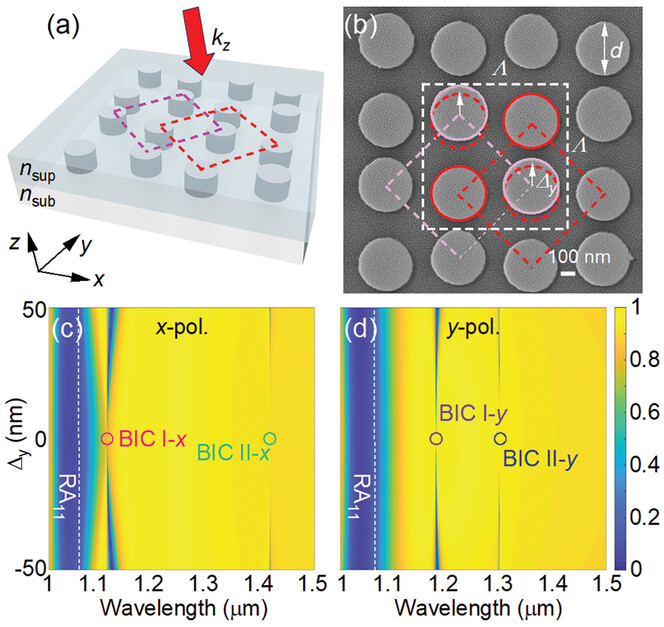 兩個相對位移的晶格雜化形成的硅基超表面,實現(xiàn)非局域準(zhǔn)束縛態(tài)(q-BICs),在硅納米柱外部區(qū)域內(nèi)產(chǎn)生均勻且顯著的近場增強