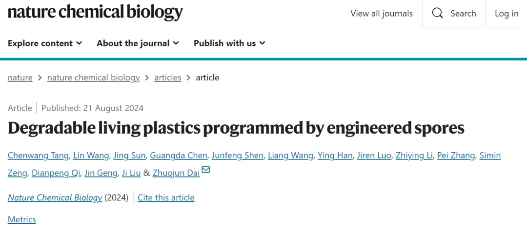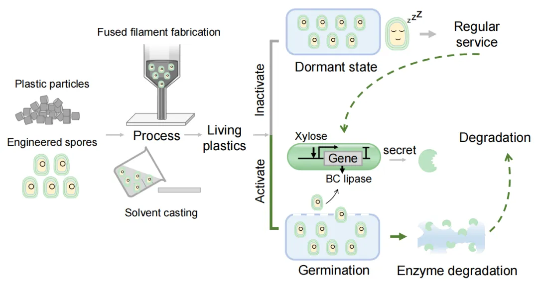 8月21日,中國科學(xué)院深圳先進技術(shù)研究院戴卓君課題組在Nature子刊Nature Chemical Biology發(fā)表題為“Degradable living plastics programmed by engineered spores”的研究工作。該工作通過對微生物進行基因編輯并產(chǎn)生具備極端環(huán)境耐受能力的孢子,使其可以在特定條件下分泌塑料降解酶;并通過塑料加工方法(高溫、高壓或有機溶劑)將孢子包埋在塑料基質(zhì)中。