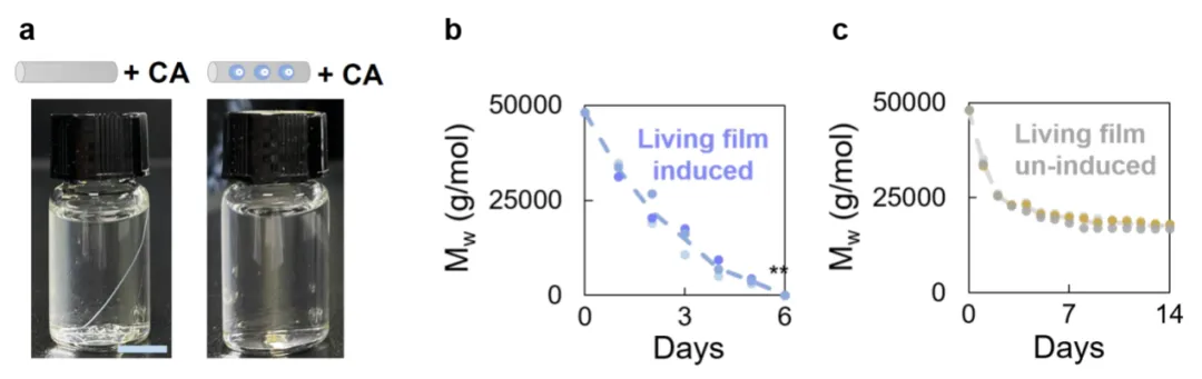 圖4. 兩種酶對PCL塑料,降解前后的表面結(jié)構(gòu)和分子量變化。(a) CA酶處理普通PCL塑料(左)和活體功能塑料(右)的降解效果;(b)活PCL降解過程中分子量變化曲線;(c) 僅CA酶對普通PCL塑料降解過程中分子量變化曲線