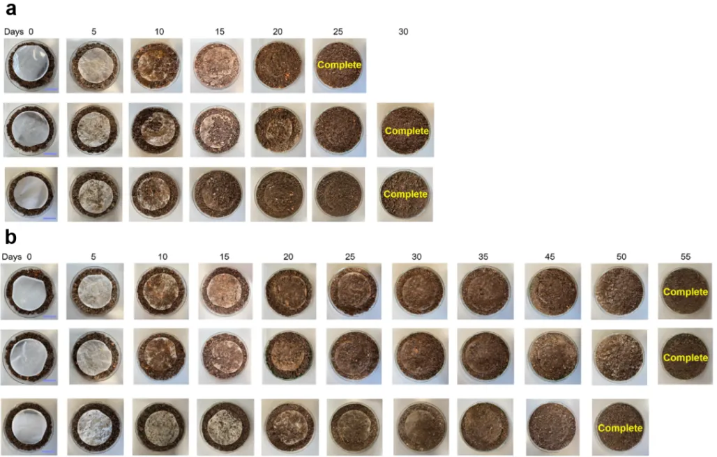 另一種孢子釋放的方法是堆肥,在不需要任何其他外源制劑的加入下,土壤環(huán)境中活塑料能夠在25-30天以內(nèi)就可被完全降解。而傳統(tǒng)PCL塑料則需要55天左右才能被降解至肉眼不可見(圖5)。