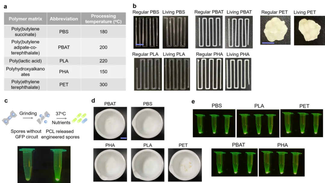 因此為了驗證系統(tǒng)的普適性,研究團隊繼續(xù)嘗試了其他的塑料體系,將帶有綠色熒光質(zhì)粒的孢子分別與PBS(聚丁二酸丁二醇酯)、 PBAT(聚己二酸對苯二甲酸丁二醇酯)、 PLA(聚乳酸)、PHA(聚羥基脂肪酸酯)甚至PET(聚對苯二甲酸乙二醇酯)進行混合加工,其中PET的加工溫度高達300攝氏度,之后通過物理研磨的方法對孢子進行了釋放。有趣的是,即使從PET塑料中釋放出來的孢子依舊可以復(fù)蘇并重新表達綠色熒光。這也為制作其他基底的活塑料奠定了良好的基礎(chǔ)(圖6)。