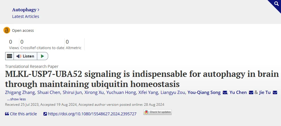 8月28日,中國(guó)科學(xué)院深圳先進(jìn)技術(shù)研究院腦認(rèn)知與腦疾病研究所(以下簡(jiǎn)稱“腦所”)/深港腦科學(xué)創(chuàng)新研究院屠潔研究員團(tuán)隊(duì)在細(xì)胞生物學(xué)領(lǐng)域的著名期刊Autophagy雜志上發(fā)表了題為“MLKL-USP7-UBA52 signaling is indispensable for autophagy in brain through maintaining ubiquitin homeostasis”的研究論文。