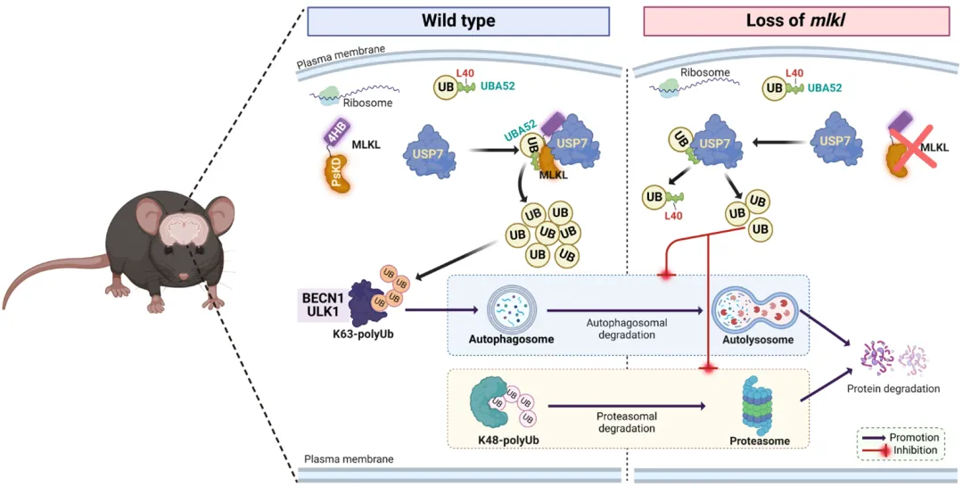 該研究歷時(shí)五年,首次揭示了MLKL誘發(fā)大腦認(rèn)知、情緒功能障礙的分子機(jī)理,即MLKL通過調(diào)控泛素穩(wěn)態(tài)影響腦中的正常自噬,從而參與腦認(rèn)知功能變化的過程。本研究為大腦認(rèn)知功能障礙性疾病的致病機(jī)理提供了新的證據(jù),提供了新的潛在防治靶點(diǎn)。另外,該研究發(fā)現(xiàn)了MLKL在程序性細(xì)胞壞死以外的新功能,為細(xì)胞壞死與大腦功能穩(wěn)態(tài)維持的研究提供了新的視角。
