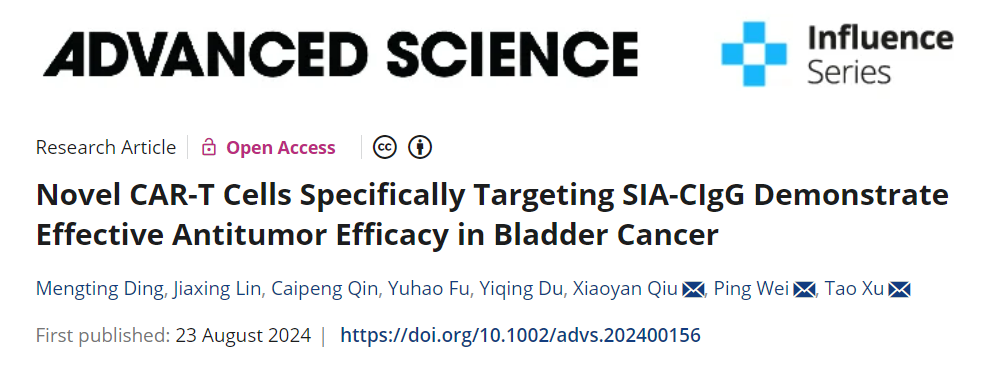 2024年8月23日,中國(guó)科學(xué)院深圳先進(jìn)技術(shù)研究院合成生物學(xué)研究所細(xì)胞與基因線路設(shè)計(jì)中心魏平課題組聯(lián)合北京大學(xué)人民醫(yī)院泌尿外科徐濤課題組和北京大學(xué)基礎(chǔ)醫(yī)學(xué)院邱曉彥團(tuán)隊(duì),在Advanced Science在線發(fā)表題為“Novel CAR-T Cells Specifically Targeting SIA-CIgG Demonstrate Effective Antitumor Efficacy in Bladder Cancer”的研究論文,報(bào)道了一種新型CAR-T細(xì)胞,能夠特異性靶向SIA-CIgG表達(dá)陽(yáng)性的膀胱癌細(xì)胞,發(fā)揮抗腫瘤作用。