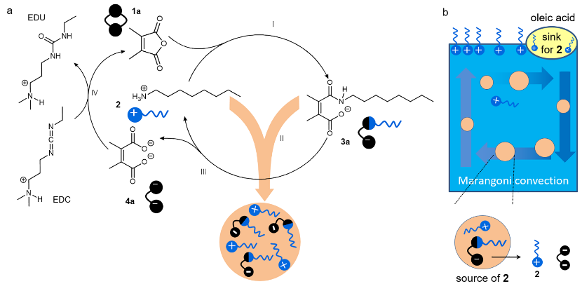 圖1. 化學燃料驅動的液滴形成和馬蘭戈尼對流