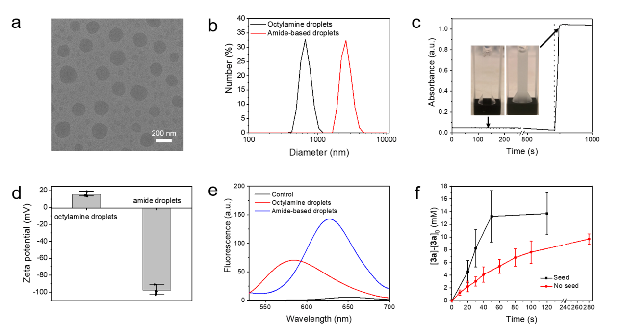 首先開發(fā)了一種耗散酰胺鍵,并構筑了活性液滴。馬來酸酐和辛胺在水溶液中反應得到一種酰胺化合物,其在酸性條件下易于水解。碳二亞胺可作為第二種燃料分子,驅動二酸廢料與辛胺重新生成酰胺化合物,從而構建耗散反應網絡。在這一過程中,酰胺產物能夠通過分子間的靜電和疏水作用與辛胺組裝形成凝聚體液滴。這些液滴中的疏水區(qū)域有助于溶解馬來酸酐,進而加速反應,實現自催化的生長。