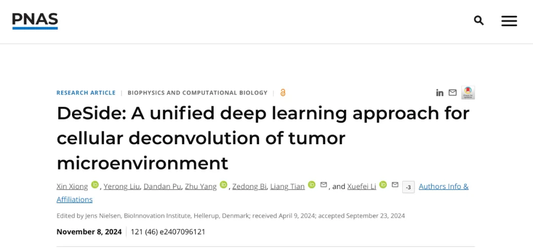 相關(guān)研究成果于11月8日以?“DeSide: A unified deep learning approach for cellular deconvolution of tumor microenvironment”為題在線發(fā)表于PNAS雜志。