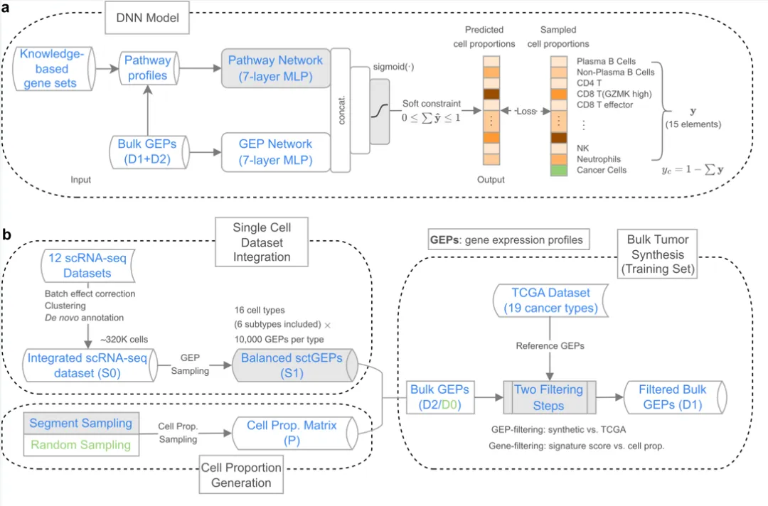 在現(xiàn)有的技術(shù)中,流式細(xì)胞術(shù)和單細(xì)胞RNA測(cè)序(scRNA-seq)等實(shí)驗(yàn)方法能夠直接測(cè)定腫瘤微環(huán)境中的細(xì)胞比例,但這些方法通常成本較高。為解決這一問題,研究人員開發(fā)了多種計(jì)算方法以基于低成本的批量RNA測(cè)序(bulk RNA-seq)數(shù)據(jù)來估算不同類型細(xì)胞的比例,例如EPIC、MuSiC、CIBERSORTx、Scaden、Kassandra等。然而,由于不同腫瘤類型中癌細(xì)胞的基因表達(dá)譜差異很大,使用單一模型精準(zhǔn)預(yù)測(cè)多種腫瘤中各類細(xì)胞的豐度仍然是一個(gè)挑戰(zhàn)。