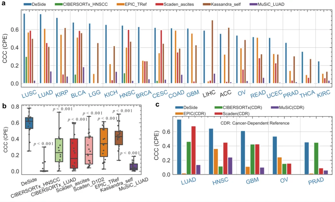▲圖2. 對(duì)比DeSide與其它算法預(yù)測(cè)bulk RNA-seq數(shù)據(jù)中腫瘤細(xì)胞比例的能力。CCC為預(yù)測(cè)的腫瘤細(xì)胞比例與基于基因拷貝數(shù)所估算的腫瘤純度之間的一致相關(guān)性系數(shù)(concordance correlation coefficient,CCC)。數(shù)據(jù)來源于癌癥基因組圖譜(The Cancer Genome Atlas,TCGA)數(shù)據(jù)庫。