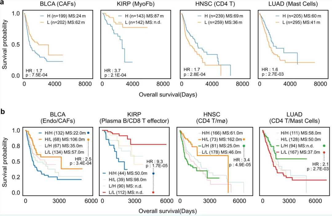 該項(xiàng)研究通過患者生存分析(Survival analysis)探索了DeSide在臨床應(yīng)用中的潛在價(jià)值。研究結(jié)果表明,基于DeSide預(yù)測(cè)的細(xì)胞比例能夠有效的將患者按照病情進(jìn)展情況進(jìn)行評(píng)估分型,即某些細(xì)胞類型或其組合的豐度與患者的生存顯著相關(guān)(圖3)。