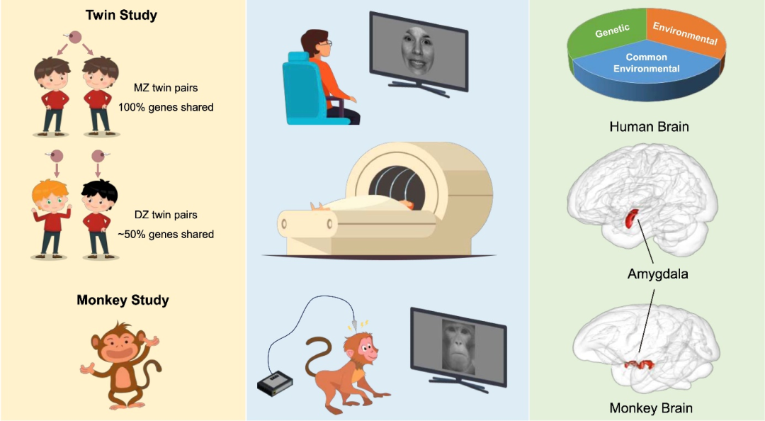圖1. 研究的整體思路:基于雙生子的行為、功能核磁共振成像實驗以及基于獼猴的電生理實驗
