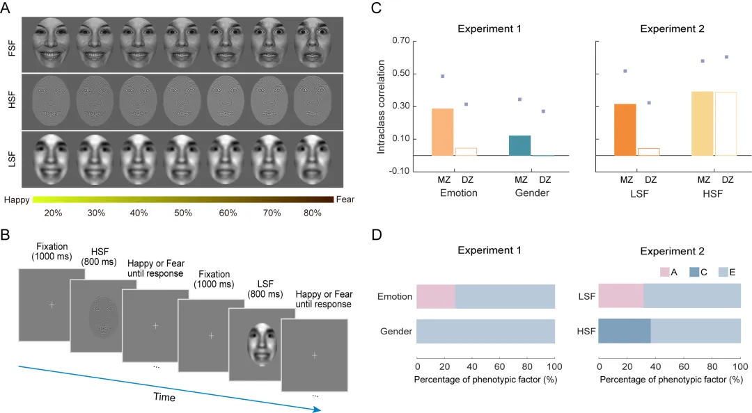 本研究采用經(jīng)典的雙生子設計,研究人類面部情感識別能力的遺傳和環(huán)境影響(圖1)。雙生子分為同卵和異卵兩類,分別具備100%和50%的基因相似度,因而是研究遺傳作用的理想對象。在該該實驗中,研究人員讓志愿者觀察包含不同空間頻率信息的情緒面孔,發(fā)現(xiàn)遺傳因素調(diào)控面部情緒知覺中的低空間頻率(LSF)加工,而高空間頻率(HSF)加工則主要受環(huán)境影響(圖2)。這一發(fā)現(xiàn)突出了遺傳與環(huán)境在面部情感識別中的不同作用,提示LSF和HSF可能是不同的處理機制。