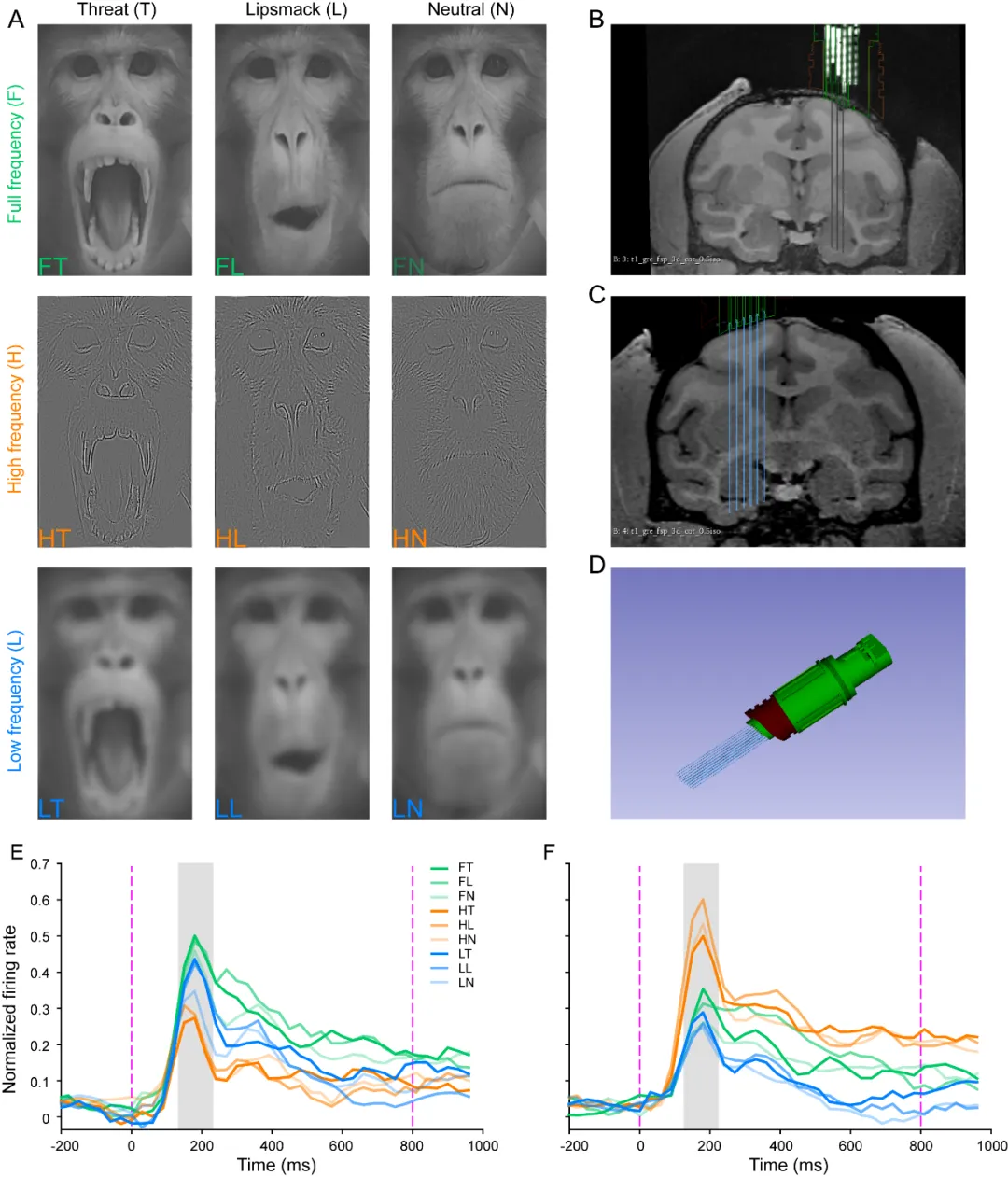 低空間頻率(LSF)主要涉及面部情感的整體特征,而高空間頻率(HSF)則關注細節(jié)和變化。該研究進一步通過fMRI發(fā)現(xiàn),LSF的情感識別與杏仁核的功能具有遺傳關聯(lián),而HSF則沒有這種關聯(lián)。這表明LSF和HSF在面部情感識別中具有不同的神經(jīng)基礎,反映了它們在情感處理過程中的功能分工。通過對獼猴杏仁核進行在體的單細胞記錄,發(fā)現(xiàn)杏仁核存在加工LSF和HSF的不同神經(jīng)元,進一步證實了LSF和HSF在面部情感感知中的區(qū)別(圖3)。