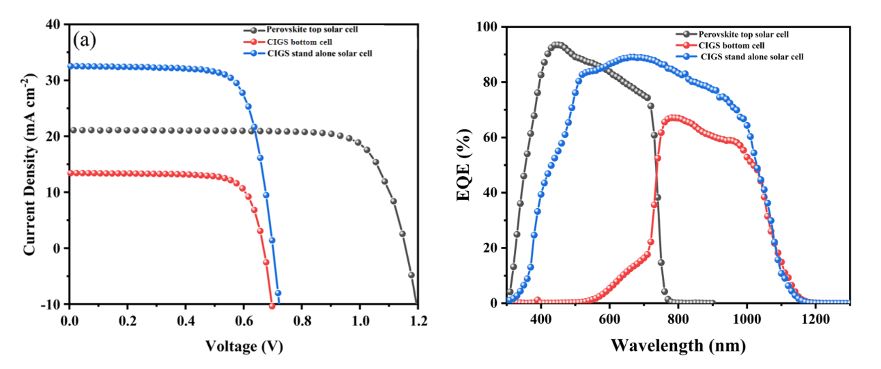 圖5:4-T串聯(lián)太陽(yáng)能電池的性能。(a)J-V曲線(xiàn)和(b)EQE曲線(xiàn)的J-V曲線(xiàn)和EQE曲線(xiàn)。
