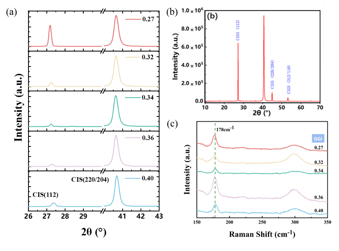 圖3:(a)不同GGI含量的XRD,(b)GGI=0.27時(shí)CIGS吸收層的XRD,(c)不同GGI含量CIGS的拉曼圖。