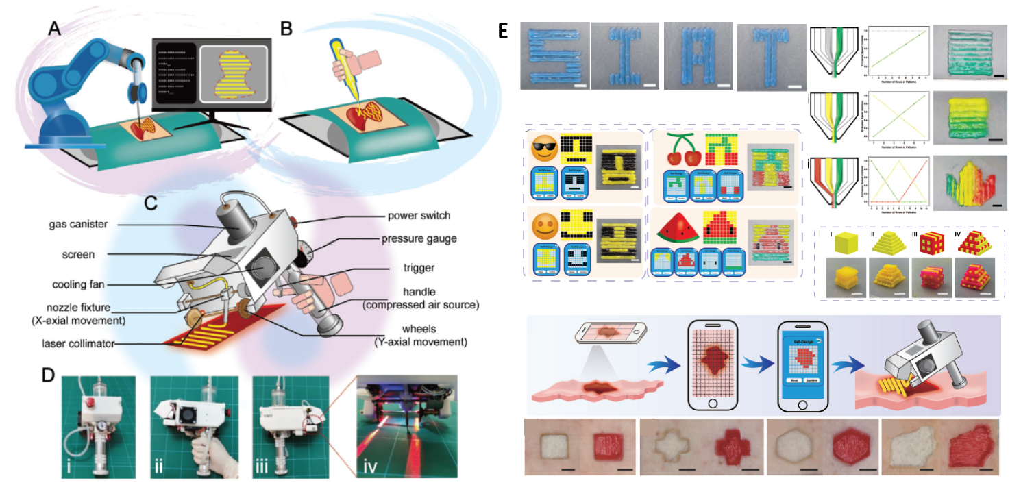 研究團(tuán)隊(duì)提出了一種結(jié)合程序化操控與手持式操作的新型原位打印理念,并自主研發(fā)了可編程手持式生物3D打印機(jī)。該設(shè)備兼容機(jī)械與氣壓驅(qū)動(dòng),適應(yīng)不同粘度的生物墨水?dāng)D出,通過智能手機(jī)APP控制,可靈活調(diào)節(jié)打印條帶尺寸。憑借可編程能力和高精度定位,該打印機(jī)支持單/多墨水及單/多層結(jié)構(gòu)打印,配合微通道功能噴頭,具備實(shí)現(xiàn)梯度特征和大范圍高速涂覆的能力。在離體與活體皮膚創(chuàng)面處理上,設(shè)備展現(xiàn)了優(yōu)異的大面積覆蓋與創(chuàng)面封閉性能,融合了傳統(tǒng)機(jī)械臂式原位打印的精度與手持設(shè)備的靈活性的優(yōu)勢,降低了制造成本與操作難度,體現(xiàn)了其作為組織再生創(chuàng)新設(shè)備的獨(dú)特價(jià)值,為高效、即時(shí)的醫(yī)療干預(yù)提供了全新解決方案。