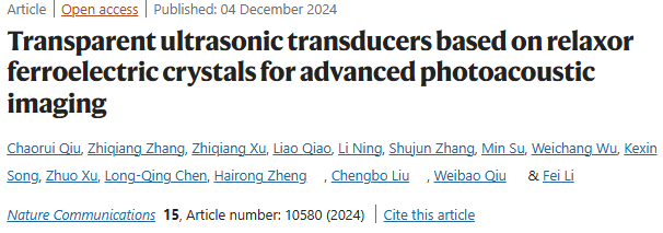 近日,中國科學院深圳先進技術(shù)研究院鄭海榮院士、邱維寶研究員、劉成波研究員團隊,與西安交通大學李飛教授團隊合作,開發(fā)了一款新型超靈敏、寬帶透明超聲換能器,突破了透明超聲換能器性能瓶頸,實現(xiàn)了高分辨、大視場、快速光聲顯微成像,為基于透明換能器的光聲成像、聲光多模態(tài)成像的生物醫(yī)學應用鋪平了道路。研究成果以“Transparent ultrasonic transducers based on relaxor ferroelectric crystals for advanced photoacoustic imaging”為題發(fā)表在Nature Communications期刊上。論文第一作者分別是西安交通大學和深圳先進院聯(lián)培博士生邱超銳、深圳先進院張志強副研究員和徐智強副研究員。