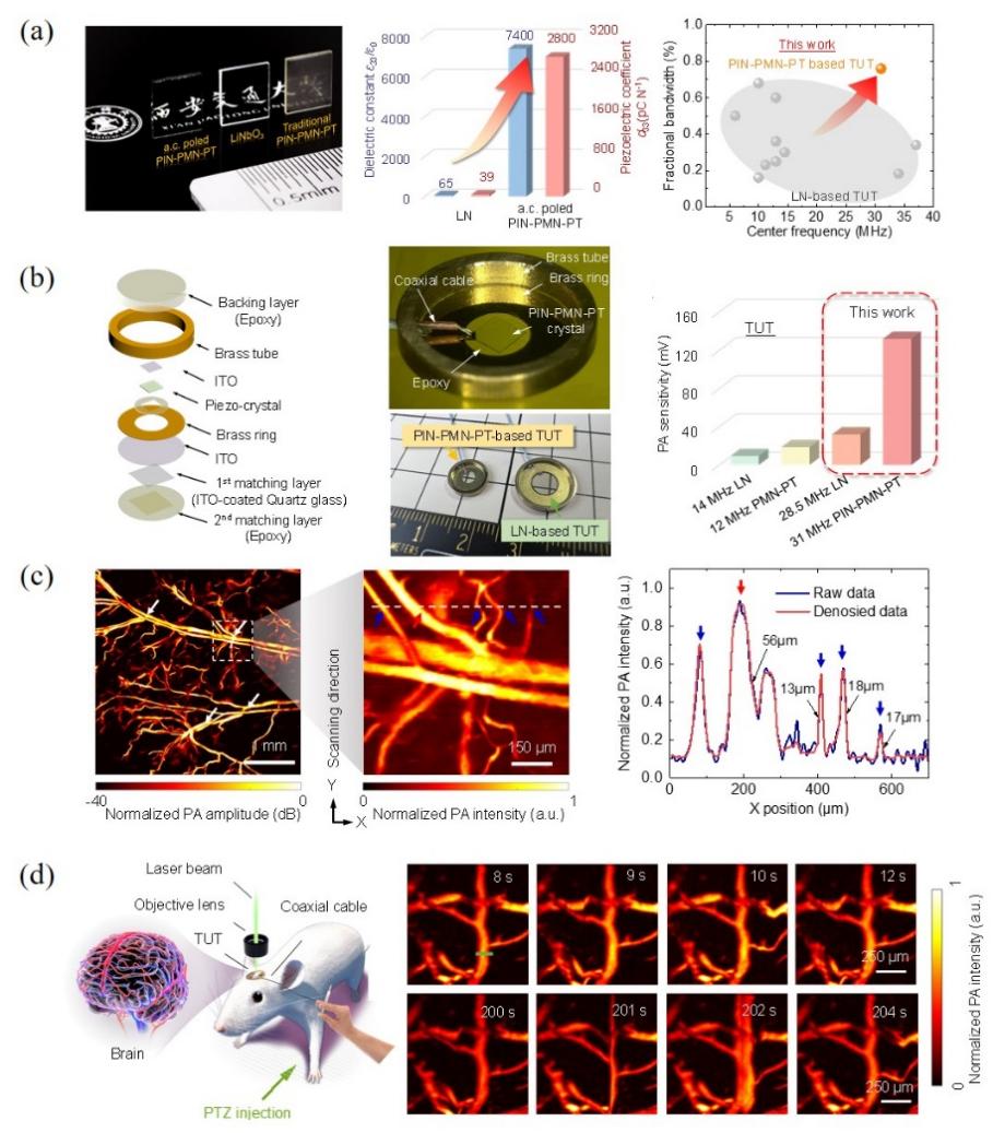 (a)PIN-PMN-PT透明壓電單晶實物照片及性能對比,(b)新型透明超聲換能器結(jié)構(gòu)示意圖、實物照片、及性能對比,(c)活體小鼠耳朵毛細血管高分辨率光聲成像,(d)癲癇模型小鼠腦血流動態(tài)光聲成像。