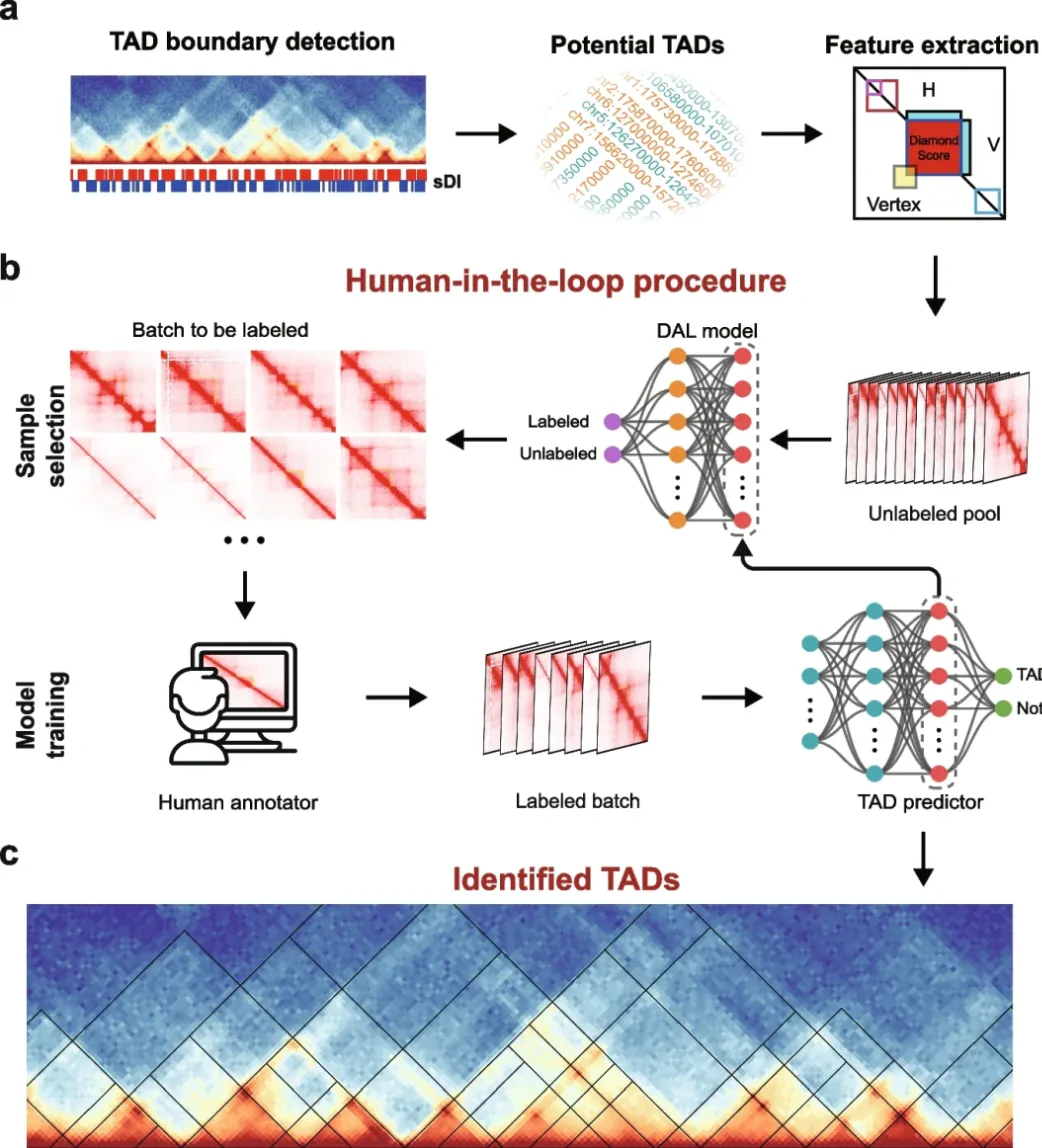團(tuán)隊(duì)首先基于數(shù)據(jù),建立了一個(gè)包含大量潛在TAD樣本的數(shù)據(jù)庫,通過簡化方向性指數(shù)(sDI)對(duì)Hi-C矩陣進(jìn)行初步篩選。隨后,采用主動(dòng)學(xué)習(xí)(Active Learning)策略對(duì)篩選樣本進(jìn)行有效標(biāo)注,成功訓(xùn)練出具有高敏感度和高精度的TAD識(shí)別模型。