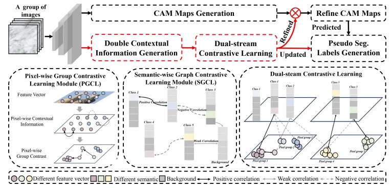 實(shí)現(xiàn)了同時(shí)利用像素級和語義級跨影像上下文信息的學(xué)習(xí)。DSCNet的核心創(chuàng)新在于其能夠同時(shí)處理像素級和語義級上下文信息,為弱監(jiān)督學(xué)習(xí)在其他計(jì)算機(jī)視覺任務(wù)中的應(yīng)用提供了新思路。