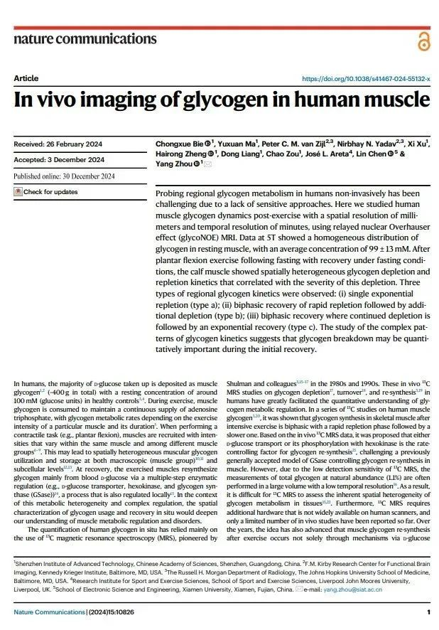 [1]?Bie,C.,Ma,Y.,van Zijl,P. C. M.,Yadav,N. N.,Xu,X.,Zheng,H.,Liang,D.,Zou,C.,Areta,J. L.,Chen,L.,& Zhou,Y. (2024). In vivo imaging of glycogen in human muscle.?Nature communications,?15(1),10826.?