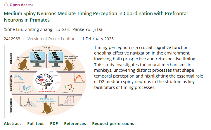 2025年2月11日,中國科學(xué)院深圳先進(jìn)技術(shù)研究院腦認(rèn)知與腦疾病研究所/深港腦科學(xué)創(chuàng)新研究院戴輯團(tuán)隊(duì),在Advanced science在線發(fā)表了題為“Medium Spiny Neurons Mediate Timing Perception in Coordination with Prefrontal Neurons in Primates”的研究論文。該研究通過在體電生理和藥理學(xué)干預(yù)技術(shù),結(jié)合眼動行為監(jiān)測技術(shù),探討了獼猴如何表征回顧性計(jì)時(Retrospective timing)以及前瞻性計(jì)時(Prospective timing)。該研究發(fā)現(xiàn)大腦采用不同的策略來處理這兩種計(jì)時過程,其中紋狀體中棘神經(jīng)元(MSN),尤其是D2-MSN,在兩種計(jì)時過程中均扮演重要角色;進(jìn)一步的網(wǎng)絡(luò)分析表明,前額葉通過增強(qiáng)與紋狀體之間的同步性來提升計(jì)時的準(zhǔn)確性。該研究深化了對時間感知神經(jīng)機(jī)制的理解,有望對未來在決策、學(xué)習(xí)和記憶等領(lǐng)域的研究帶來新的啟示!