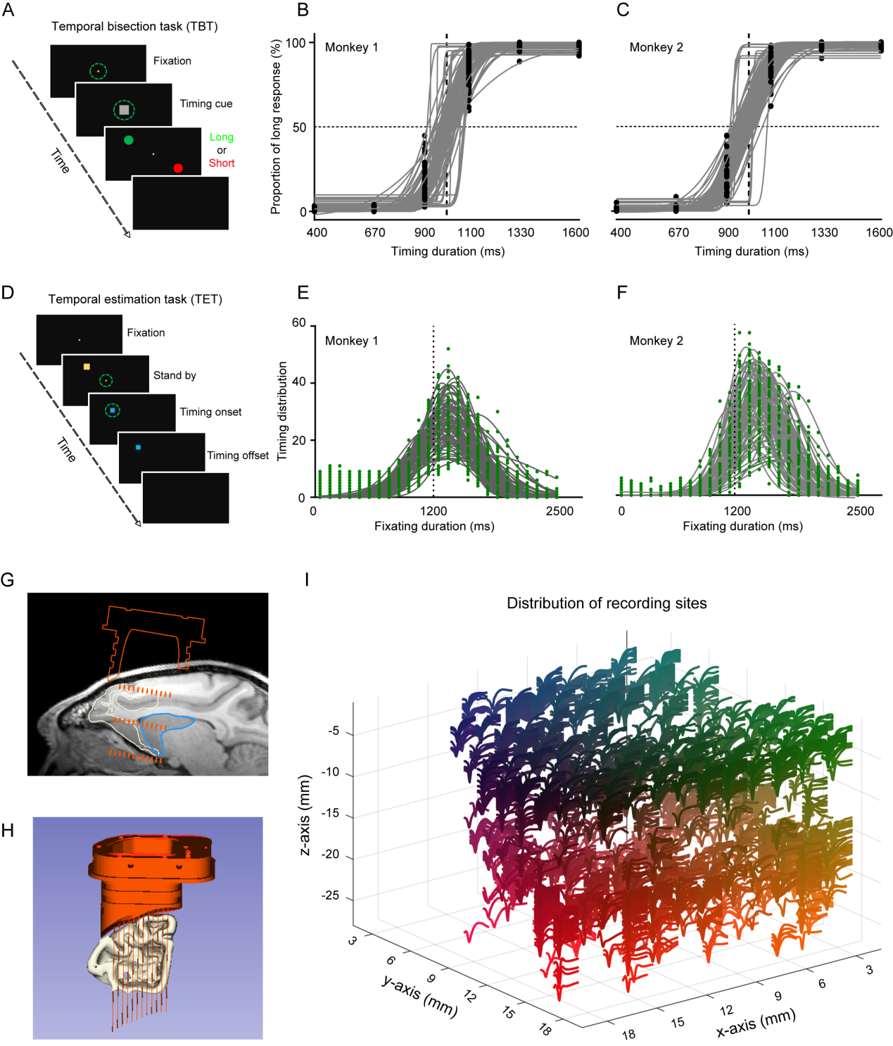 本研究對獼猴開展了兩項(xiàng)時距知覺任務(wù)的訓(xùn)練,分別是時間分辨任務(wù)(Temporal bisection task,TBT)和時間估計(jì)任務(wù)(Temporal estimation task,TET)(圖1)。其中,TBT任務(wù)是向獼猴呈現(xiàn)時長不定(0.4、0.67、0.9、1.1、1.33、1.6s)的視覺刺激,并要求獼猴在視覺刺激消失后判斷刺激的呈現(xiàn)時長是比?1s?長還是短。結(jié)果表明,刺激呈現(xiàn)時長越長,其判斷為“長”的概率就越高,表明獼猴掌握了?TBT?任務(wù)的規(guī)則。在?TBT?中,獼猴是在刺激消失后才對其呈現(xiàn)時長進(jìn)行判斷,屬于回顧性計(jì)時。而TET任務(wù)則是給獼猴呈現(xiàn)一個視覺刺激,并由其通過注視決定在何時結(jié)束該刺激的呈現(xiàn)。當(dāng)獼猴對刺激的注視時長處于?1.2 – 2.5s?之間時,能夠獲得獎賞。結(jié)果顯示,獼猴也成功掌握了該計(jì)時規(guī)則。在?TET?中,獼猴對注視時長有預(yù)期,且需要在判斷注視時長到達(dá)閾限后結(jié)束注視,屬于前瞻性計(jì)時。