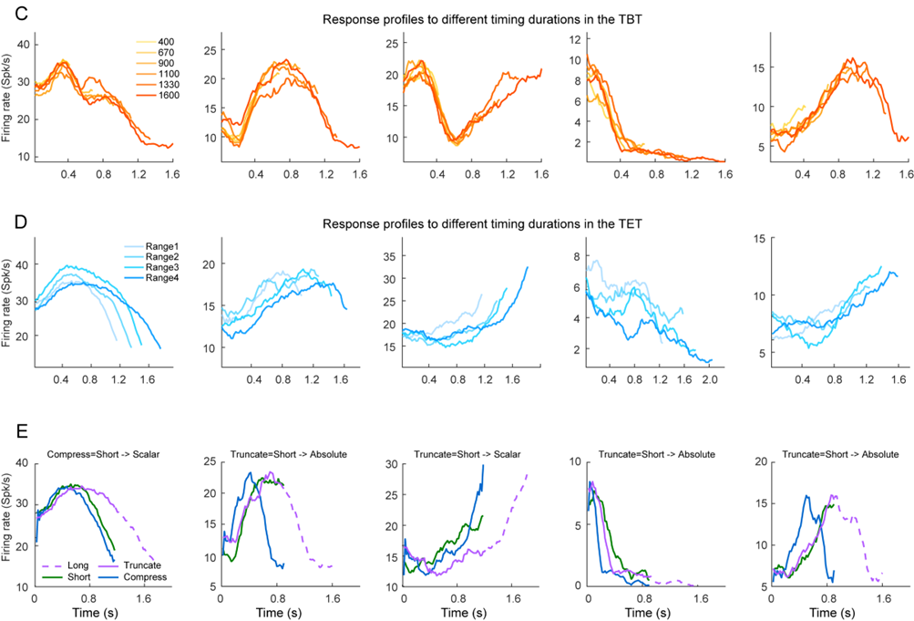 研究人員通過植入慢性可移動電極,從獼猴的前額葉和紋狀體記錄了3000多個神經(jīng)元對兩項(xiàng)時距知覺任務(wù)的反應(yīng)。在TBT中,獼猴無法預(yù)期視覺刺激的呈現(xiàn)時間,無論計(jì)時的長短,許多神經(jīng)元的發(fā)放率并未隨著刺激呈現(xiàn)時長變化而改變其發(fā)放模式,稱為“絕對編碼(Absolute coding)”。在TET中,許多神經(jīng)元的發(fā)放率對不同主觀時長呈現(xiàn)相似的模式,并可通過壓縮實(shí)現(xiàn)對齊,稱為“可壓縮編碼(Scalar coding)”,也稱 “相對編碼(Relative coding)”。這一結(jié)果提示了神經(jīng)元以不同的模式編碼前瞻性和回顧性計(jì)時中的時間信息(圖2)。