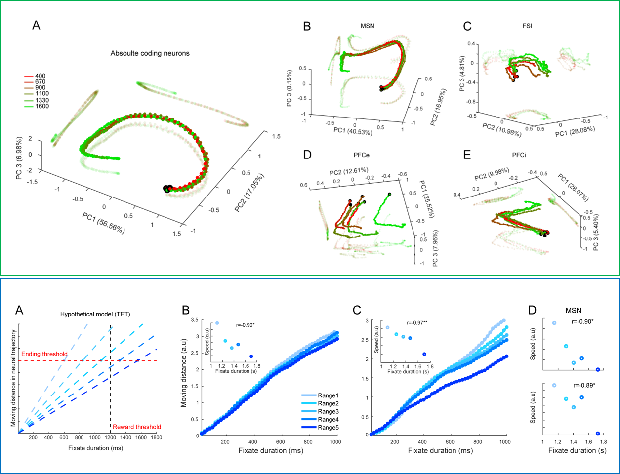 研究人員分別對前額葉(PFC)以及紋狀體的神經(jīng)元波形數(shù)據(jù)進(jìn)行降維聚類,區(qū)分了紋狀體中棘神經(jīng)元(Medium spiny neuron,MSN)和中間神經(jīng)元(Fast-spiking interneuron,FSI)信號,以及PFC中興奮性神經(jīng)元(PFCe)及抑制性神經(jīng)元(PFCi)信號。研究人員發(fā)現(xiàn),MSN有最高比例的神經(jīng)元展示了“絕對編碼”或“相對編碼”的反應(yīng)模式。在主成分空間描述神經(jīng)元活動變化的“神經(jīng)軌跡”的變化速度,能夠表征獼猴在TBT以及TET中時距知覺行為的差異(圖3):即MSN集群變化的速度越快,獼猴在TBT中越傾向于判斷為“長”,而在TET中的注視時長會縮短。這提示了獼猴的主觀時長變化速度與MSN的活動速度成正相關(guān),這些結(jié)果強(qiáng)調(diào)了MSN在編碼主觀時長信息中的重要作用。