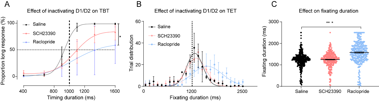 由于MSN神經(jīng)元具有不同的亞型,為了區(qū)分是哪些亞型神經(jīng)元在主導(dǎo)時間知覺加工,研究人員進(jìn)一步通過藥理學(xué)實(shí)驗(yàn),分別失活D1-MSN和D2-MSN,考察不同類型MSN神經(jīng)元的作用。他們發(fā)現(xiàn),失活D2-MSN能夠顯著降低獼猴在TBT中判斷為“長”的概率,以及延緩在TET的注視時長(圖4)。這一結(jié)果提示了D2-MSN是表征生物“Internal clock”的關(guān)鍵亞型神經(jīng)元。由于D2-MSN在運(yùn)動控制、計(jì)劃、行為轉(zhuǎn)換中扮演關(guān)鍵角色,這一結(jié)果也提示了時距知覺與運(yùn)動控制的緊密聯(lián)系。