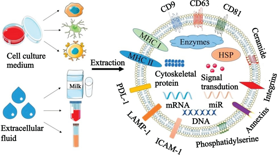 外泌體作為一類尺寸介于30至200 nm之間的小型膜狀囊泡,可由健康細胞和腫瘤細胞釋放,其攜帶著來自其親本細胞的豐富的分子信息(如 DNA、RNA 和蛋白質(zhì)),憑借獨特的結(jié)構(gòu)和組成使其成為重要生物標志物(圖1)。外泌體參與細胞間通訊、血管生成、免疫反應(yīng)和癌癥轉(zhuǎn)移等關(guān)鍵細胞過程,與生命活動息息相關(guān)。近年來對外泌體的特異性識別和表征成為了生物醫(yī)學(xué)研究和液體活檢領(lǐng)域的焦點。研究者們致力于開發(fā)更加精準、高效的方法來捕捉和分析外泌體,以期在疾病診斷、治療監(jiān)測以及新藥研發(fā)等方面取得突破性進展。