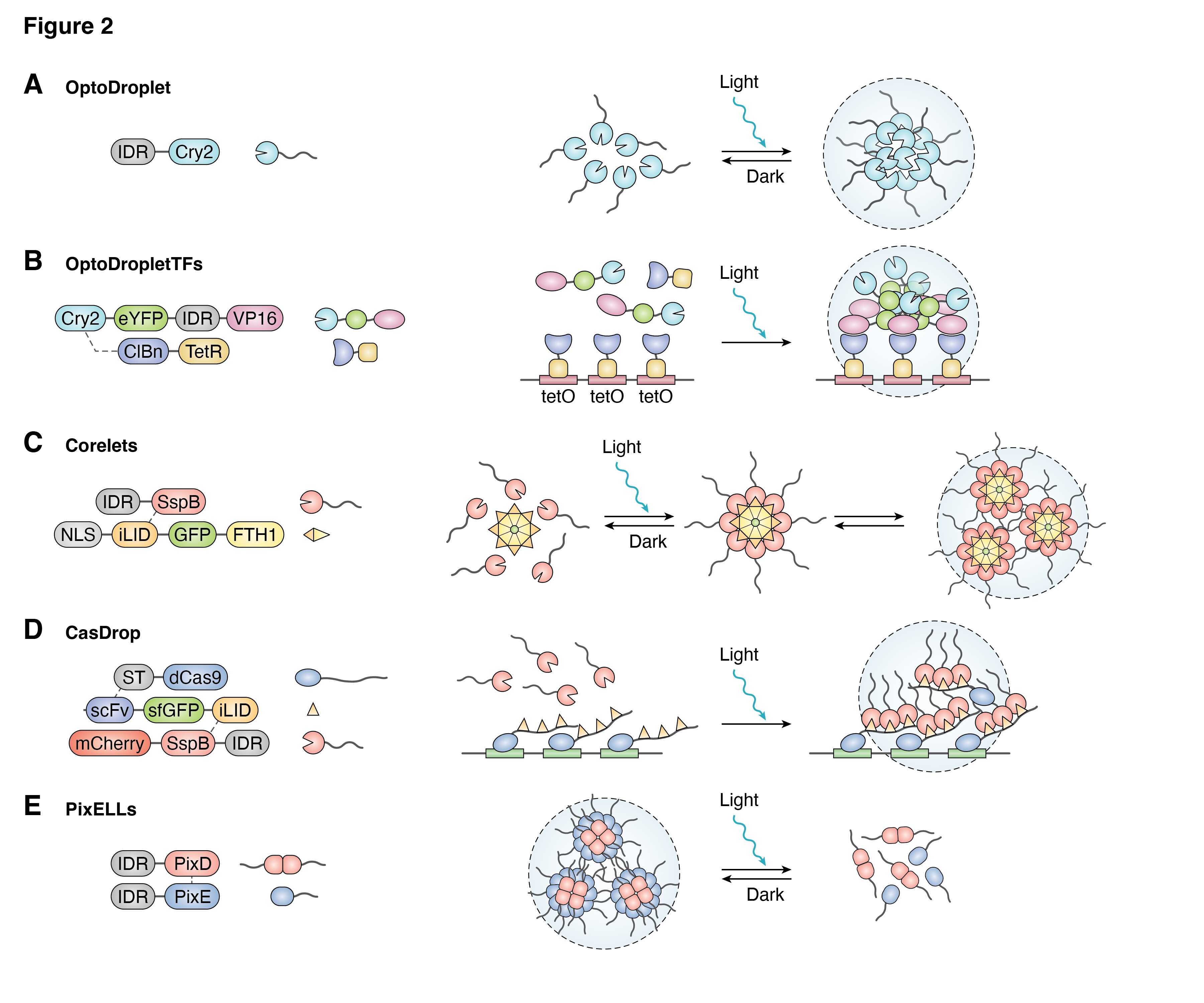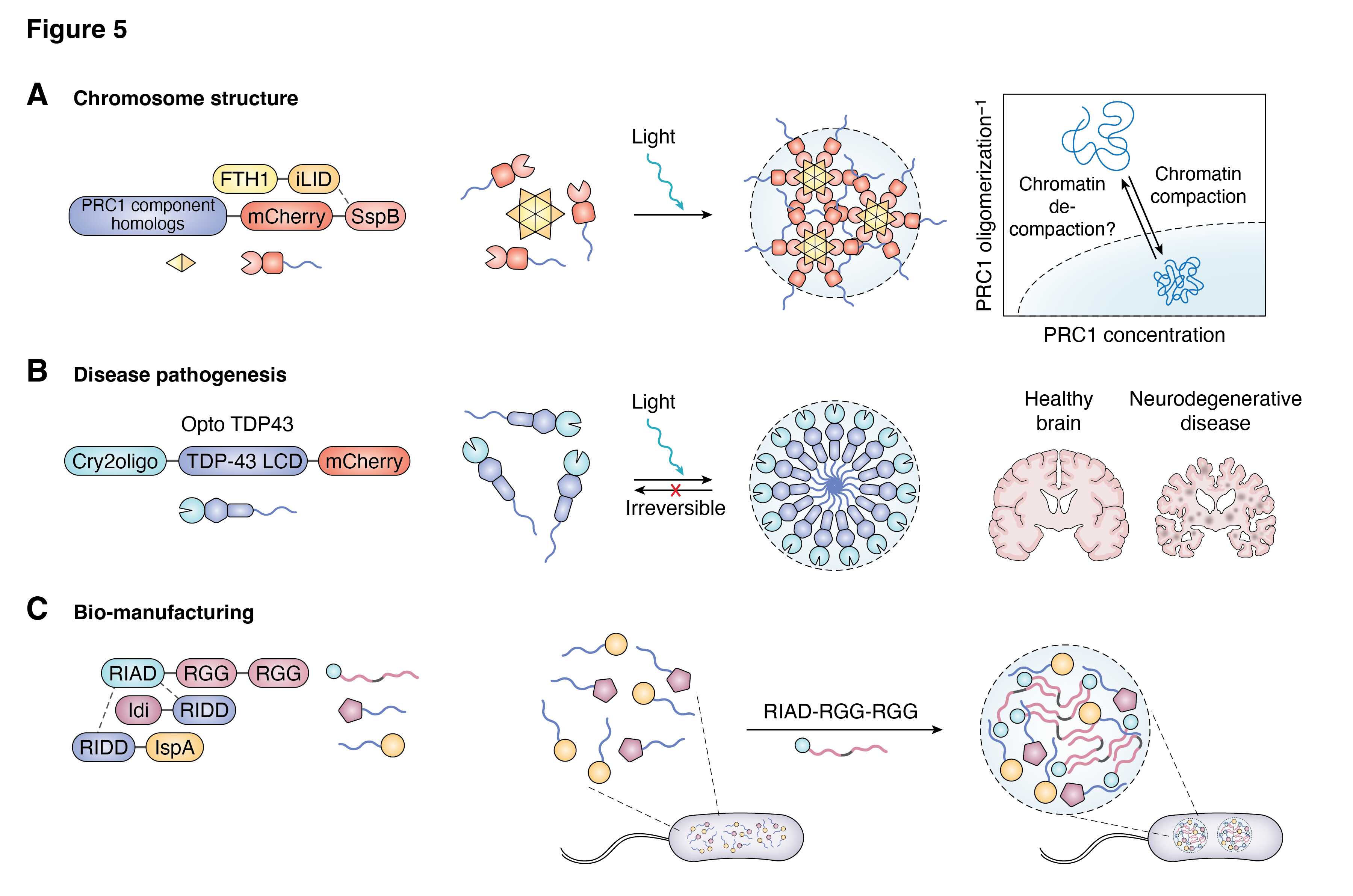 SBMCs在染色體結(jié)構(gòu)研究中的應(yīng)用:染色體的組織對(duì)基因表達(dá)和穩(wěn)定性至關(guān)重要。Polycomb suppressicomplex 1(PRC1)是一種染色質(zhì)修飾復(fù)合物,參與維持染色質(zhì)的抑制狀態(tài)。Clifford Brangwynne團(tuán)隊(duì)通過(guò)Corelets系統(tǒng)設(shè)計(jì)了一種光激活的多組分PRC1凝聚物,闡明了PRC1在染色質(zhì)致密化中的機(jī)制。這項(xiàng)研究為染色體結(jié)構(gòu)研究提供了理想的實(shí)驗(yàn)平臺(tái)。
