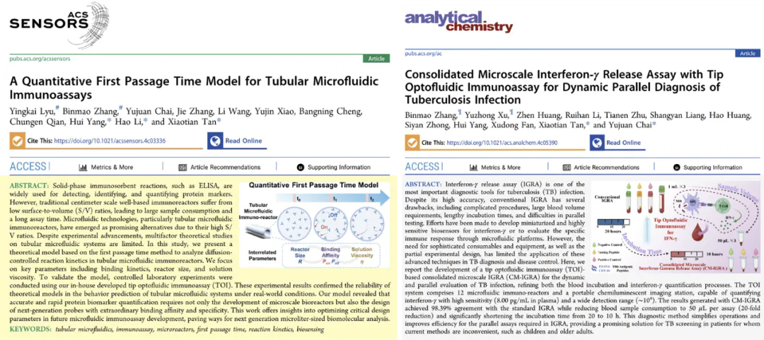 1月30日至31日,中國(guó)科學(xué)院深圳先進(jìn)技術(shù)研究院(簡(jiǎn)稱“深圳先進(jìn)院”)生物醫(yī)學(xué)與健康工程研究所傳感中心楊慧研究員、譚驍天副研究員課題組先后在生物傳感領(lǐng)域國(guó)際期刊ACS Sensors和Analytical Chemistry上發(fā)表2篇論文,介紹團(tuán)隊(duì)在微流控生物分子傳感領(lǐng)域取得的系統(tǒng)性突破。研究論文分別從理論建模和技術(shù)創(chuàng)新層面攻克了微量液相生物樣本中生物標(biāo)志物分析難題,建立了管狀微流控免疫反應(yīng)器的多影響因素耦合模型,并基于傳感中心自研的便攜式微流控化學(xué)發(fā)光免疫分析平臺(tái)(TOI)開發(fā)出了可進(jìn)行全血直檢的結(jié)核病T細(xì)胞免疫響應(yīng)定量檢測(cè)技術(shù),為結(jié)核病快速、便捷免疫篩查提供了新思路。