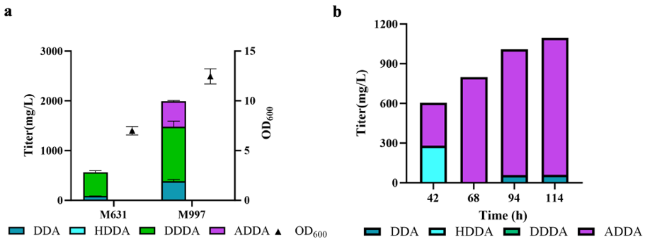 基于對DDA細胞毒性和DDDA合成機制的深入理解,研究人員對大腸桿菌進行了改造,使其能夠將葡萄糖和纖維二糖轉化為ADDA,同時減少DDDA的積累以及DDA對細胞生長的負面影響。在以纖維二糖為主要碳源的條件下,菌株M997實現(xiàn)了509 mg/L的ADDA產(chǎn)量。菌株M1001在15升發(fā)酵罐中達到了1035 mg/L,從糖到ADDA的轉化率為5%,且未檢測出DDDA的積累。