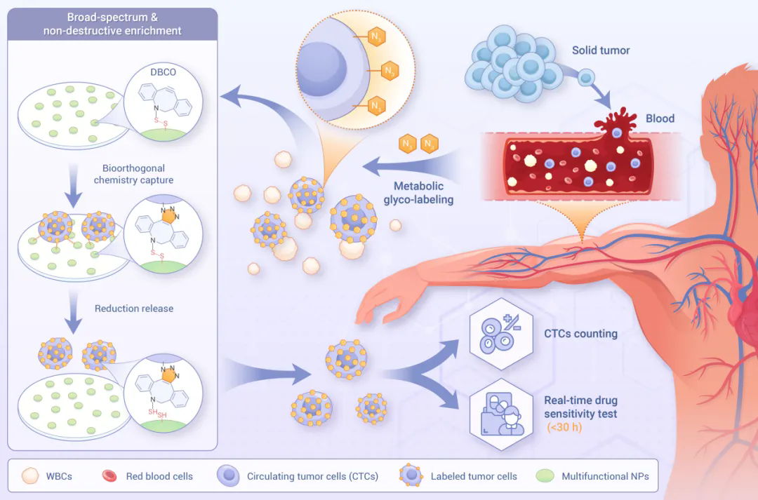 CTC是脫離腫瘤病灶、進(jìn)入并存活于循環(huán)系統(tǒng)的腫瘤細(xì)胞,其出現(xiàn)是腫瘤擴(kuò)散、轉(zhuǎn)移的早期標(biāo)志性事件。因此,CTC檢測具有發(fā)現(xiàn)腫瘤轉(zhuǎn)移、預(yù)后評估等多重臨床意義?,F(xiàn)有CTC檢測主要基于天然生理生化靶標(biāo),存在對異質(zhì)CTC覆蓋不夠、檢測結(jié)果干擾嚴(yán)重、下游應(yīng)用受限等不足。本文從腫瘤細(xì)胞普遍存在異常糖代謝出發(fā),探索利用代謝糖標(biāo)記(Metabolic glyco-labeling)在細(xì)胞表面構(gòu)建均質(zhì)靶標(biāo)(neo-marker)來高度覆蓋異質(zhì)CTC,并針對該靶標(biāo)開發(fā)基于生物正交反應(yīng)和可逆反應(yīng)的捕獲和釋放策略,在≥10種不同癌癥中實(shí)現(xiàn)精準(zhǔn)、無損分離異質(zhì)CTC,并拓展建立基于痕量CTC的下游實(shí)時(shí)藥敏測試策略。?