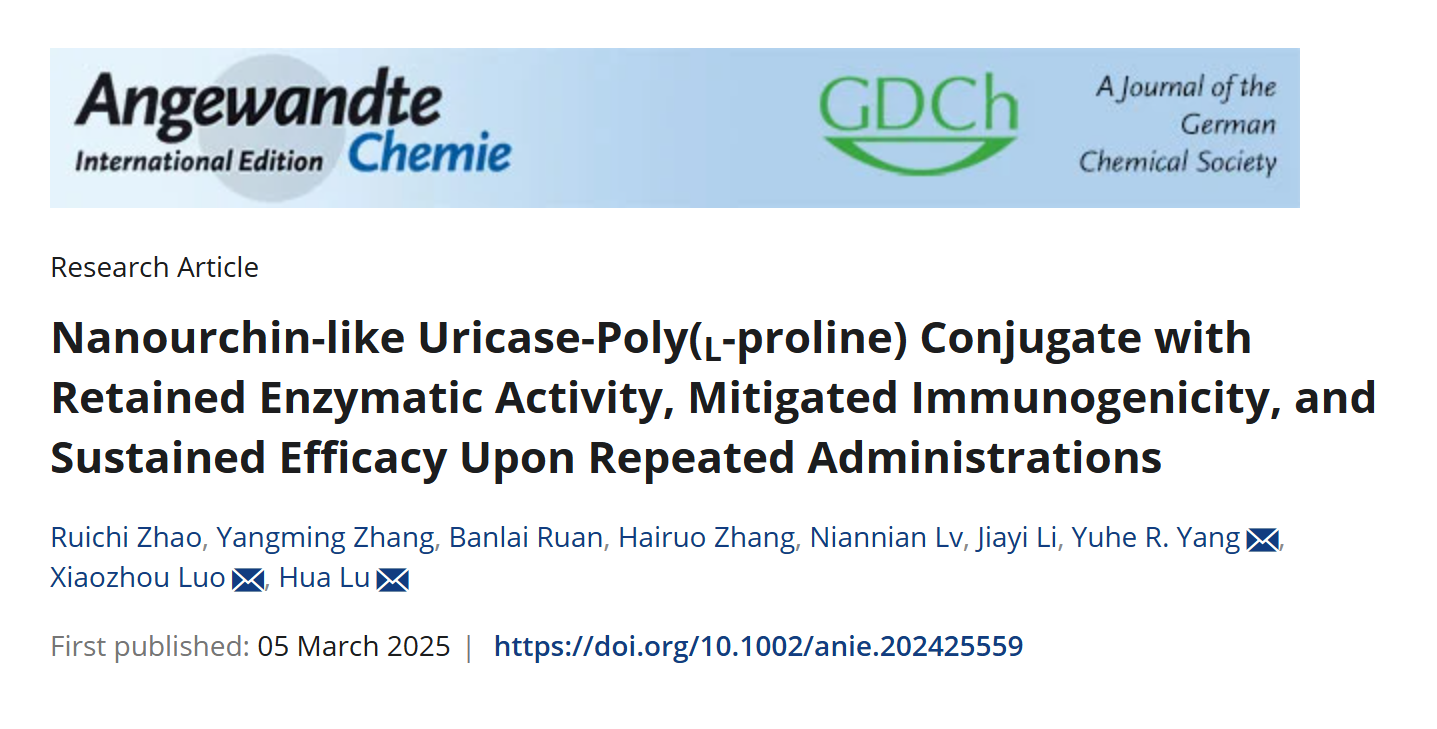 2025年3月5日,北京大學呂華團隊、中國科學院深圳先進技術研究院羅小舟團隊、國家納米科學中心楊雨荷團隊在Angewandte Chemie International Edition上發(fā)表合作文章“Nanourchin-like Uricase-Poly(L-proline) Conjugate with Retained Enzymatic Activity, Mitigated Immunogenicity, and Sustained Efficacy Upon Repeated Administrations”,提出一種全新的蛋白藥物修飾方法,為解決蛋白藥物長效化與高免疫原性難題提供重要突破手段。