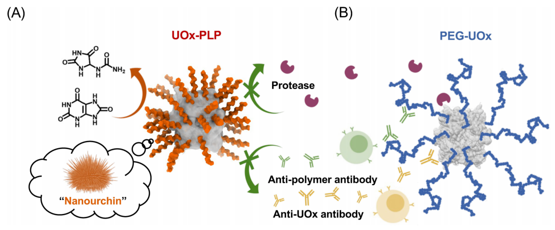 研究團隊通過獨創(chuàng)的“原位接枝聚合”技術,將剛性聚脯氨酸(PLP)以高密度原位修飾于尿酸酶表面,形成具有納米級“海膽”結(jié)構的尿酸氧化酶-聚脯氨酸偶聯(lián)物(UOx-PLP)。其核心突破包括: