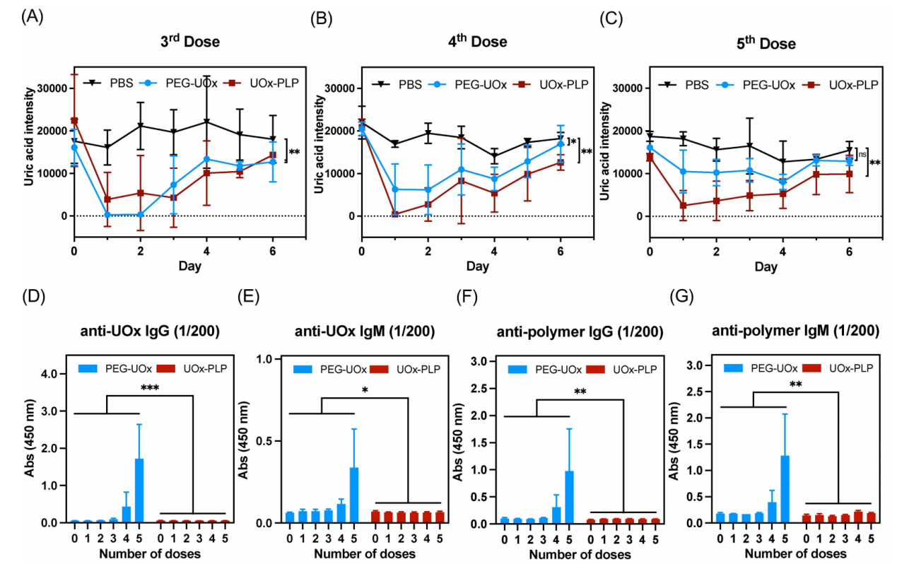 針對高尿酸血癥與痛風這一嚴峻的臨床現(xiàn)狀,研究團隊構建了擬人化高尿酸血癥小鼠動物模型進行了五次連續(xù)尿酸酶給藥實驗。實驗結(jié)果顯示,UOx-PLP組小鼠的血尿酸水平在給藥后顯著降低,并且五次給藥后療效無明顯衰減,血尿酸水平仍低于治療閾值;此外,UOx-PLP在小鼠體內(nèi)的藥代動力學特征穩(wěn)定,半衰期較長,能夠持續(xù)發(fā)揮降低尿酸的作用。相比之下,PEG-UOx組藥物在第三次后即出現(xiàn)明顯的療效下降,且療效下降與其血液中抗藥抗體增加在時間上高度一致。這一實驗結(jié)果不僅證明了UOx-PLP在治療高尿酸血癥方面的優(yōu)越性,還為該新型蛋白修飾方法的臨床應用提供了有力的支持。