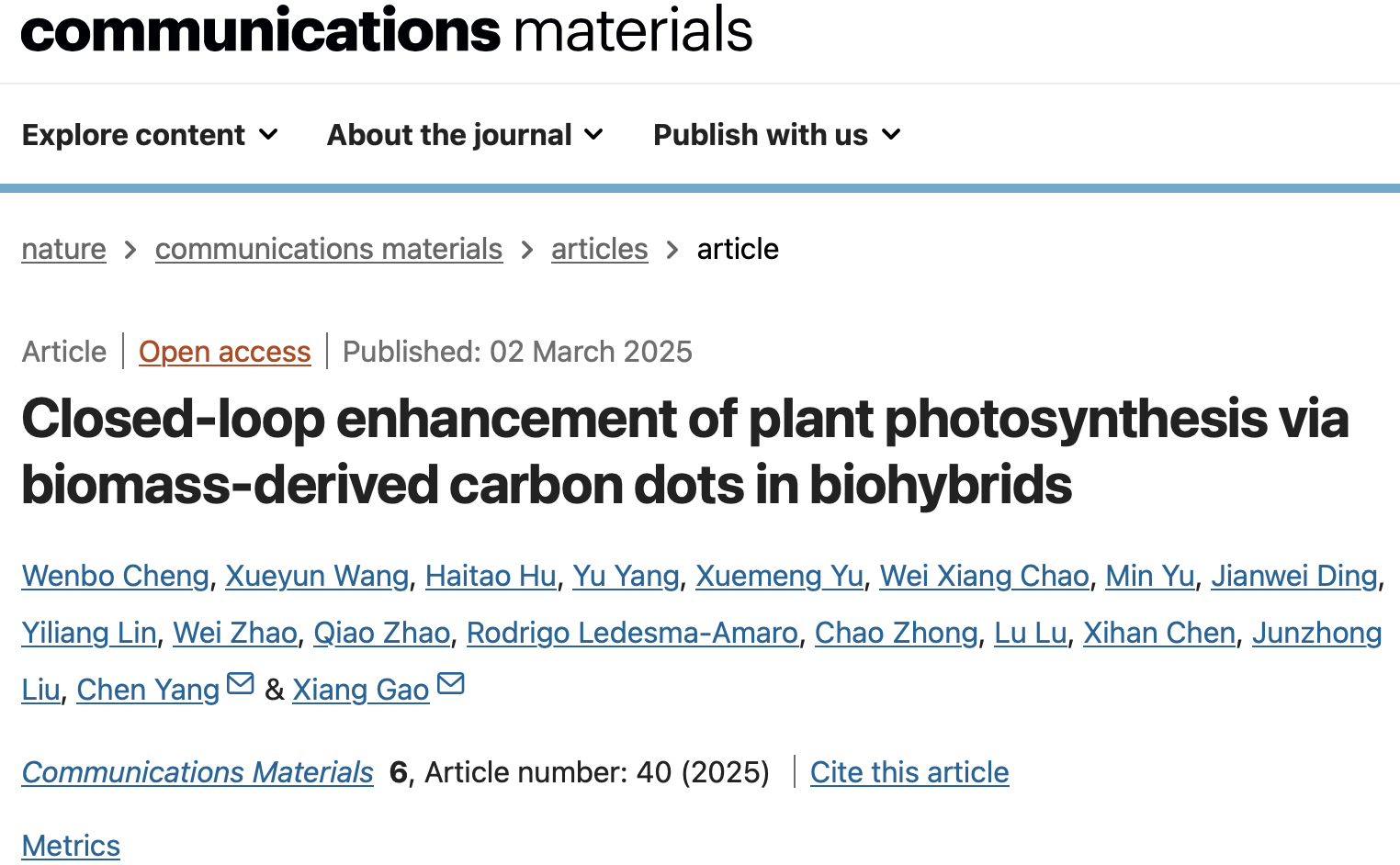 Communications Materials | 開發(fā)碳基納米材料增強植物光合作用,加速納米技術(shù)在農(nóng)業(yè)領(lǐng)域應(yīng)用