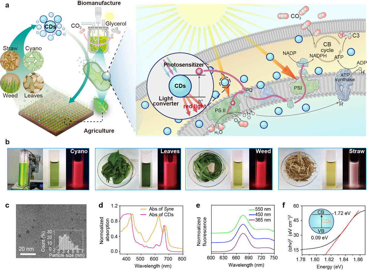 為提升光合作用的效率,研究人員長期以來都致力于探索創(chuàng)新解決方案。近期,中國科學(xué)院深圳先進技術(shù)研究院副研究員高翔團隊聯(lián)合上海交通大學(xué)教授楊琛團隊,在國際期刊Communications Materials上發(fā)表題為“Closed-loop enhancement of plant photosynthesis via biomass-derived carbon dots in biohybrids”的最新研究成果,團隊成功研發(fā)了一種以農(nóng)業(yè)廢棄物生物質(zhì)為原料合成的碳基納米材料——碳量子點(CDs),并將其用于增強植物的光合作用(圖1)。