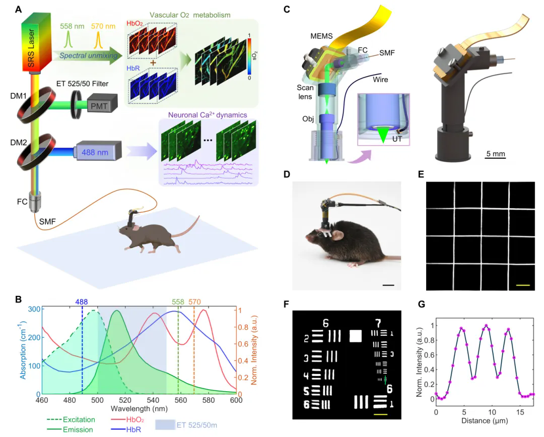(A)頭戴式光聲/熒光雙模態(tài)成像平臺;(B)雙模態(tài)激發(fā)與發(fā)射光譜;(C)微型化成像探頭設(shè)計;(D)小鼠頭戴式自由活動;(E)成像視場標定,標尺:50 μm;(F-G)分辨率標定,標尺:40 μm。