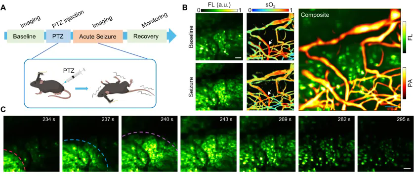 (A)小鼠癲癇模型誘導;(B)小鼠正?;顒优c癲癇發(fā)作時的神經(jīng)元鈣活動信號和血氧飽和度(左),以及代表性雙模態(tài)融合圖(右);(C)癲癇波傳輸過程記錄。標尺:50 μm。