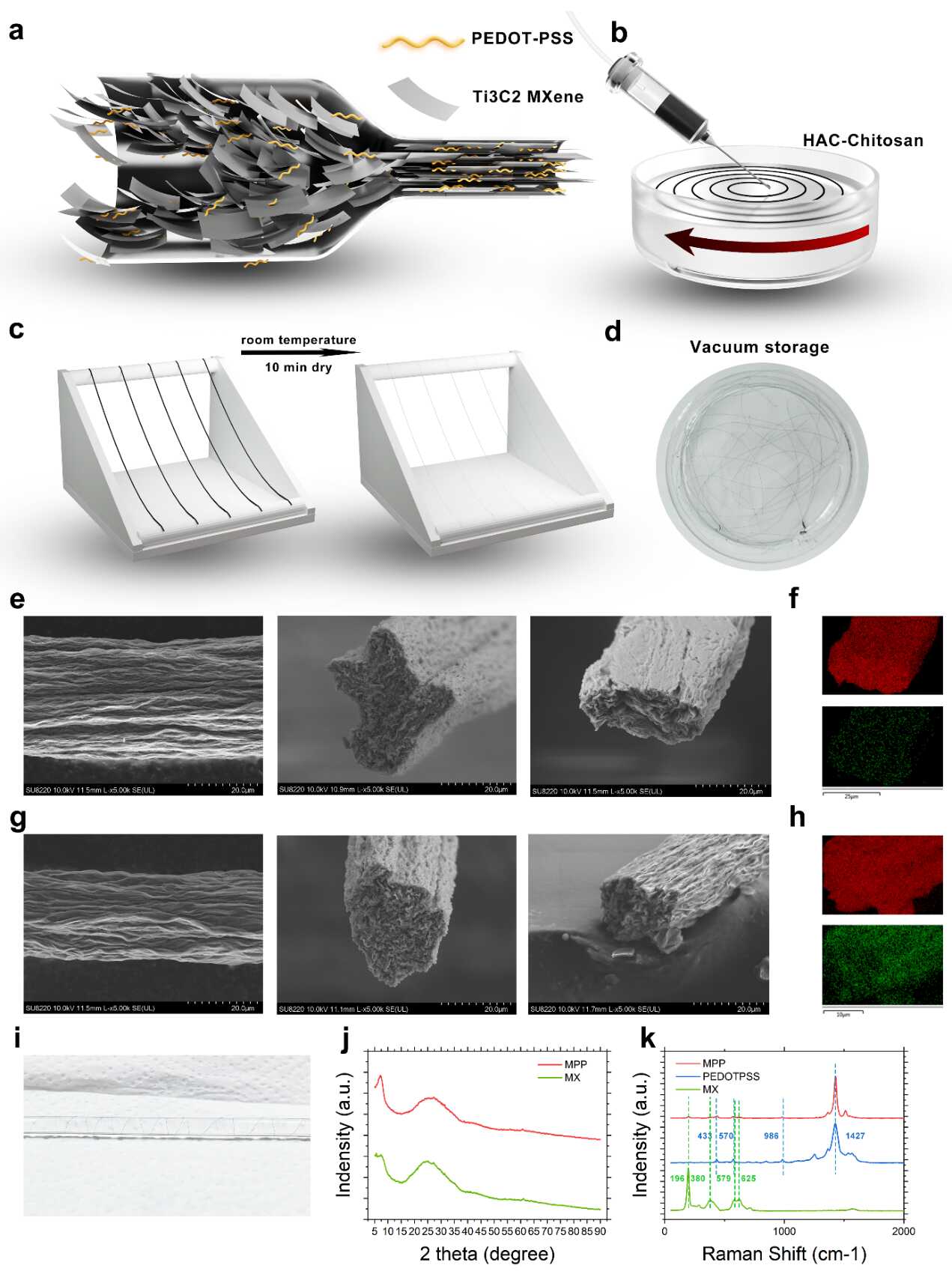 這項(xiàng)研究工作中MXene基電極電學(xué)性能的大幅度的提高主要依賴(lài)于液晶相納米片的微納結(jié)構(gòu)。在剪切力作用下,注射器中的各向同性納米片在進(jìn)入殼聚糖-低濃度醋酸凝固液時(shí)會(huì)轉(zhuǎn)變?yōu)橄蛄袘B(tài),誘導(dǎo)有序液晶MXene結(jié)構(gòu)域的排列。低濃度的PEDOT-PSS無(wú)法形成長(zhǎng)程有序結(jié)構(gòu),通過(guò)靜電吸附均勻分布在MXene片層間。殼聚糖聚合物鏈會(huì)導(dǎo)致水逐漸從紡絲溶液中排出,有助于MXene納米片初始組裝成均勻堆疊結(jié)構(gòu)的過(guò)程,形成具有高殘余含水量的粗糙凝膠狀長(zhǎng)絲。在應(yīng)變控制凝固過(guò)程中,凝膠長(zhǎng)絲中的水分由于蒸汽壓而蒸發(fā),使得MXene納米片之間的范德華力和靜電相互作用表現(xiàn)出很強(qiáng)的吸引效應(yīng)。由于應(yīng)變控制,納米片的旋轉(zhuǎn)熵顯著降低,迫使它們?cè)诶w維內(nèi)進(jìn)一步軸向排列。測(cè)試結(jié)果表明,PEDOT-PSS分子鏈的加入并未顯著干擾納米片結(jié)構(gòu)的排列,并且能保持溶液中的線型醌類(lèi)結(jié)構(gòu),在不增加電極體積的情況下沿軸向和徑向提供額外的電子離域路徑。