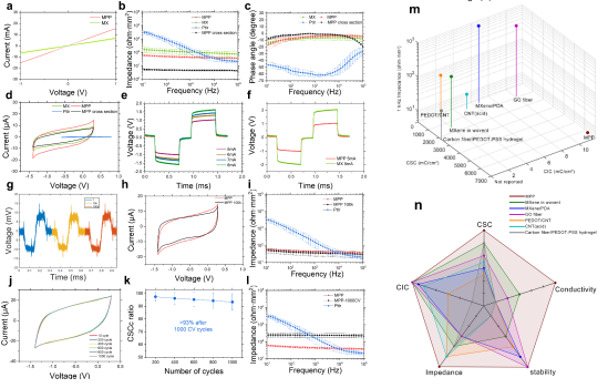 該技術(shù)的核心優(yōu)勢(shì)源于材料性能的生物學(xué)適配:43.16 Ω/mm2的低阻抗特性(較鉑銥合金降低3.7倍),989.77 mC/cm2的電荷存儲(chǔ)能力(提升108倍),11.81 mC/cm2的電荷注入能力,優(yōu)良生物相容性與核磁成像兼容性。這些特性共同解決了傳統(tǒng)電極在記錄和刺激中的界面性能受限和成像偽影等難題。