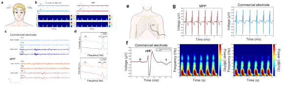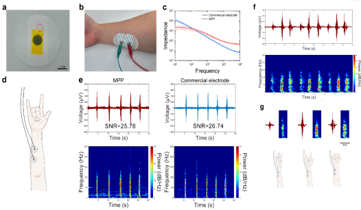 在非侵入式應(yīng)用中,MPP電極微型記錄位點(diǎn)(僅為商用Ag/AgCl電極的1/700)實(shí)現(xiàn)了25.78 dB的高信噪比(圖3e),其MXene/PEDOT-PSS復(fù)合結(jié)構(gòu)支持肌電、腦電與心電信號(hào)多種信號(hào)采集。尤為突出的是0.0047 cm2接觸面積可動(dòng)態(tài)解析肌肉收縮時(shí)序(圖3f),這一亞毫秒級(jí)分辨能力可能為帕金森病等運(yùn)動(dòng)障礙疾病的早期診斷提供了新型動(dòng)態(tài)監(jiān)測(cè)工具,突破了傳統(tǒng)體表電極因尺寸限制(通常>3 cm2)導(dǎo)致信號(hào)空間模糊的技術(shù)瓶頸。