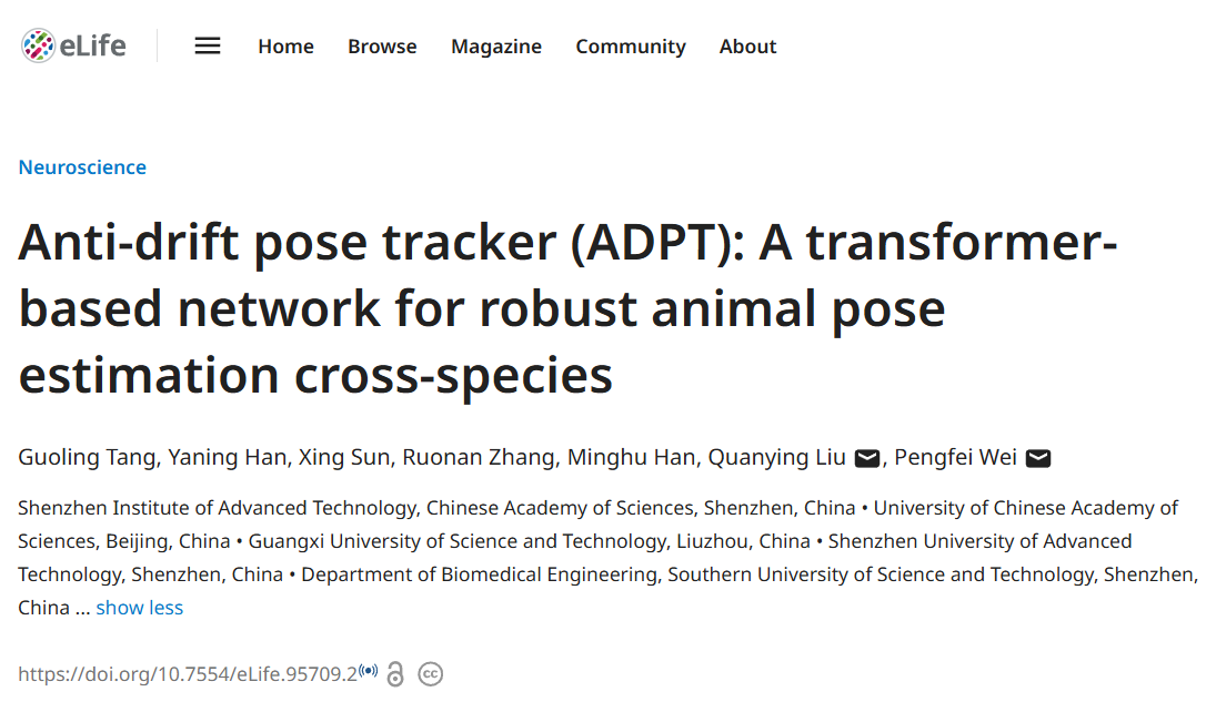 近日,中國(guó)科學(xué)院深圳先進(jìn)技術(shù)研究院(簡(jiǎn)稱“深圳先進(jìn)院”)腦認(rèn)知與腦疾病研究所/深港腦科學(xué)創(chuàng)新研究院蔚鵬飛研究員團(tuán)隊(duì)在國(guó)際學(xué)術(shù)期刊eLife發(fā)表了題為“Anti-drift pose tracker (ADPT):A transformer-based network for robust animal pose estimation across species”的研究論文。研究團(tuán)隊(duì)提出了一種基于Transformer架構(gòu)的抗漂移姿態(tài)追蹤技術(shù)(ADPT),成功實(shí)現(xiàn)跨物種動(dòng)物姿態(tài)追蹤的高精度、高魯棒性檢測(cè)。