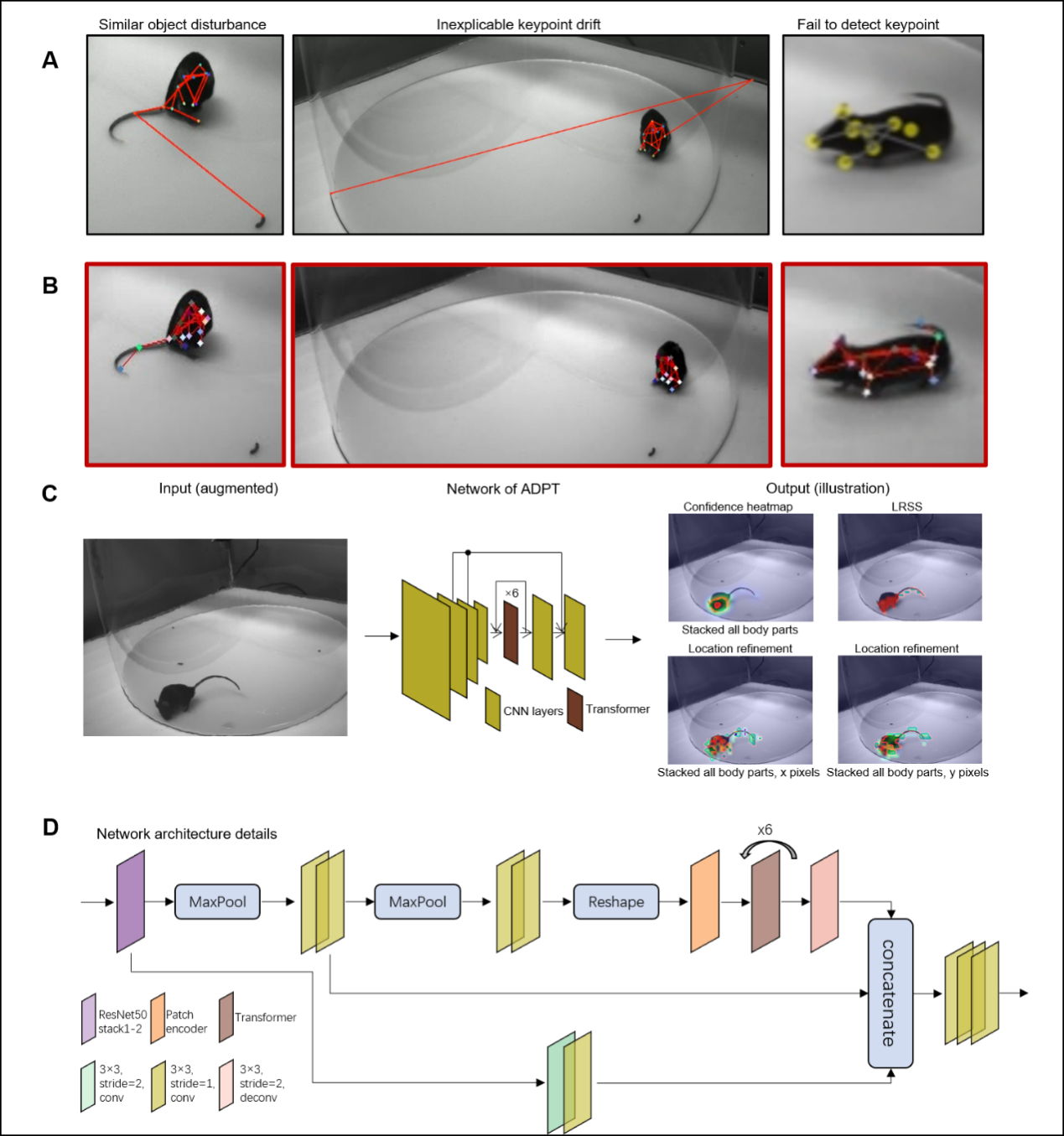 ADPT融合了卷積神經(jīng)網(wǎng)絡(luò)(CNN)與Transformer結(jié)構(gòu)的優(yōu)勢(shì),一方面利用CNN提取圖像的局部精細(xì)特征,另一方面通過(guò)Transformer有效捕捉身體各部位之間的全局依賴關(guān)系,顯著降低了關(guān)鍵點(diǎn)的漂移現(xiàn)象(圖1)。與DeepLabCut、SLEAP等現(xiàn)有方法的對(duì)比測(cè)試顯示,ADPT在復(fù)雜的多動(dòng)物交互和長(zhǎng)時(shí)程行為追蹤任務(wù)中具有明顯的精度與穩(wěn)定性優(yōu)勢(shì)。