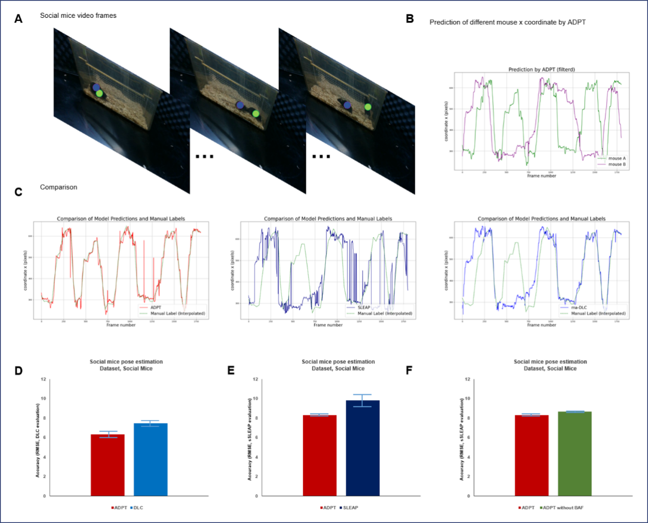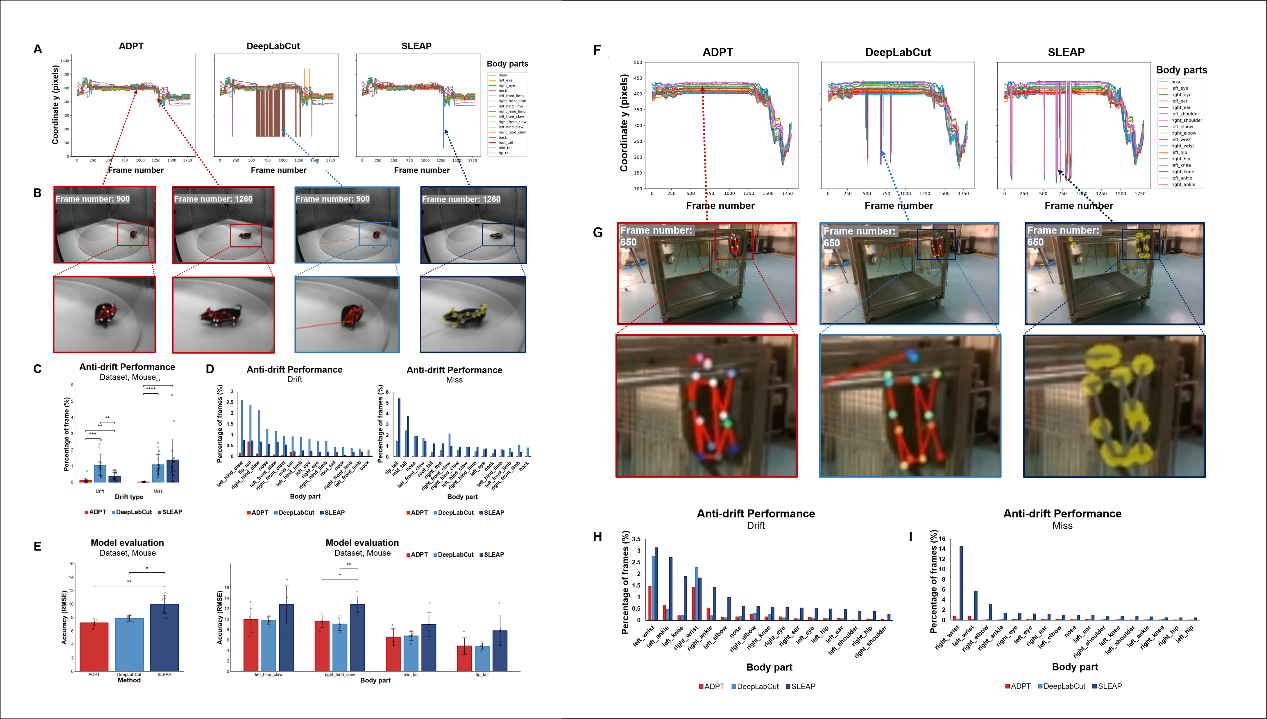 研究團(tuán)隊(duì)對(duì)多物種(包括小鼠、食蟹猴等)的行為視頻數(shù)據(jù)集進(jìn)行了深入評(píng)估。在小鼠數(shù)據(jù)集中,ADPT有效解決了傳統(tǒng)方法難以準(zhǔn)確檢測(cè)的尾尖等細(xì)微部位追蹤問(wèn)題,總體檢測(cè)精度較DeepLabCut與SLEAP方法提高超過(guò)8.6%,平均均方根誤差(RMSE)降至7.19 ± 0.58像素,表現(xiàn)出顯著優(yōu)勢(shì)(圖2左)。在食蟹猴行為數(shù)據(jù)集中,ADPT在復(fù)雜環(huán)境干擾下依舊成功實(shí)現(xiàn)靈長(zhǎng)類動(dòng)物的姿態(tài)穩(wěn)定追蹤。特別是在存在人類干擾的場(chǎng)景中,其他方法容易誤將人類識(shí)別為目標(biāo)動(dòng)物,而ADPT表現(xiàn)出對(duì)跨物種干擾的優(yōu)秀抵抗能力,確保了追蹤精度與可靠性(圖2右)。
