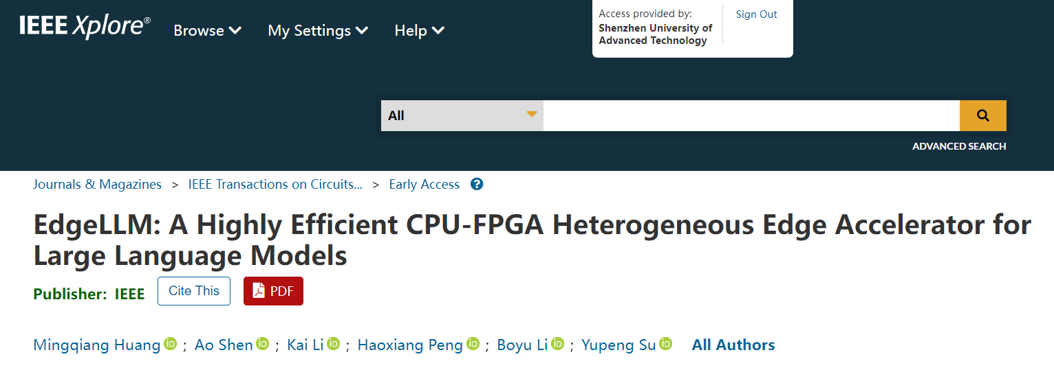 近日,中科院深圳先進技術(shù)研究院黃明強研究員團隊在大模型AI芯片領(lǐng)域取得重要進展,其研究成果在電路與系統(tǒng)領(lǐng)域頂級期刊IEEE Transactions on Circuits and Systems I: Regular Papers上在線發(fā)表,論文題目為“EdgeLLM: A Highly Efficient CPU-FPGA Heterogeneous Edge Accelerator for Large Language Models”。該研究成功攻克人工智能大語言模型(LLM)在資源受限邊緣設(shè)備部署的核心難題,為智能機器人、便攜設(shè)備等場景的實時AI應用提供了創(chuàng)新解決方案。