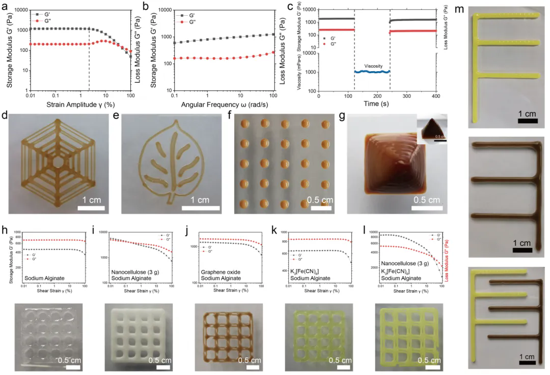 希瓦氏菌生物被膜的儲(chǔ)能模量(G′)大于損耗模量(G′′),呈現(xiàn)出彈性固體狀水凝膠的特性,使其能夠進(jìn)行3D打?。▓D2)。研究人員成功打印出多種定制形狀和幾何圖形,涵蓋一維到三維,如蜘蛛網(wǎng)、大面積網(wǎng)、葉子、點(diǎn)陣列,甚至一個(gè)1厘米高的三維金字塔。3D環(huán)境為生物體系的功能發(fā)揮提供了良好的場(chǎng)所,研究進(jìn)一步將其封裝在藻酸鹽水凝膠中,確保細(xì)菌細(xì)胞在生物裝置制造和后續(xù)使用過程中的活力。10%的藻酸鹽水凝膠表現(xiàn)出粘性液體狀特性,其損耗模量(G′′)高于儲(chǔ)能模量(G′)。為了增加粘度,研究人員在水凝膠中添加了納米纖維素,當(dāng)納米纖維素含量從10%增加到30%時(shí),水凝膠轉(zhuǎn)變?yōu)閺椥怨腆w膠??紤]到生物能源裝置的制備,研究人員進(jìn)而在水凝膠中引入了0.05%的氧化石墨烯,不僅增強(qiáng)了導(dǎo)電性,同時(shí)還提升了粘彈性。包含希瓦氏菌的活體水凝膠可以作為陽極材料,另外將K?[Fe(CN)?]封裝在藻酸鹽水凝膠中可以作為陰極材料。為了展示生物能源裝置的潛力,將陽極生物墨水和陰極墨水裝入單獨(dú)的墨盒中,可打印出叉指電極,展示了定制化和自動(dòng)化制造的潛力。